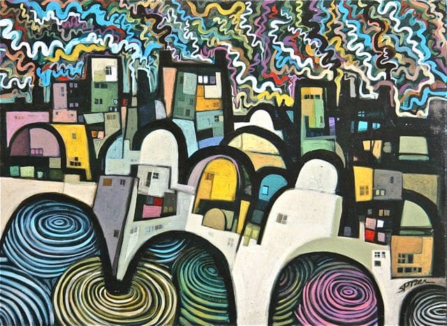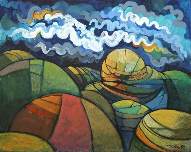 In the later half of his life James Spitzer focused his attention on fusing his woodcut materials into murals, as well as painting in acrylics. Throughout his career his subjects were abstracted land- and cityscapes, often rolling hills of California and Wisconsin seen through a brightly-hued lens, as well as humorous, caricatured portraits and scenes of daily life.